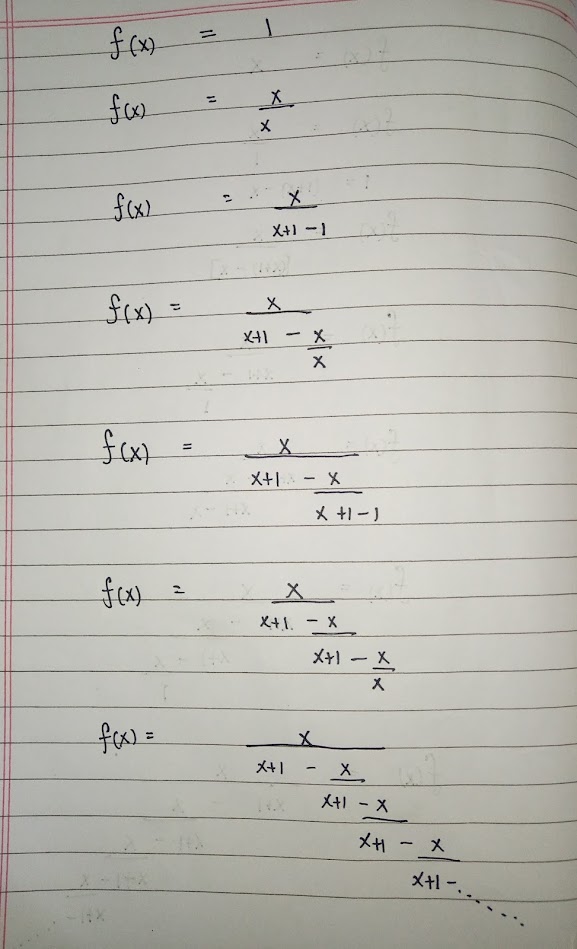 Hopefully the image is clear. We start with the common f(x)=x function and write it as x/1. Now comes the magic. 1 is written as (x+1)-x. This allows us to create a loop which extends upto infinity because the expression for 1 has an x and the expression for x has 1. I suggest you to pause and ponder about this wonderful looping idea.